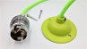 Lime green side entry cord grip with black plastic grub screw and nut and earth tag