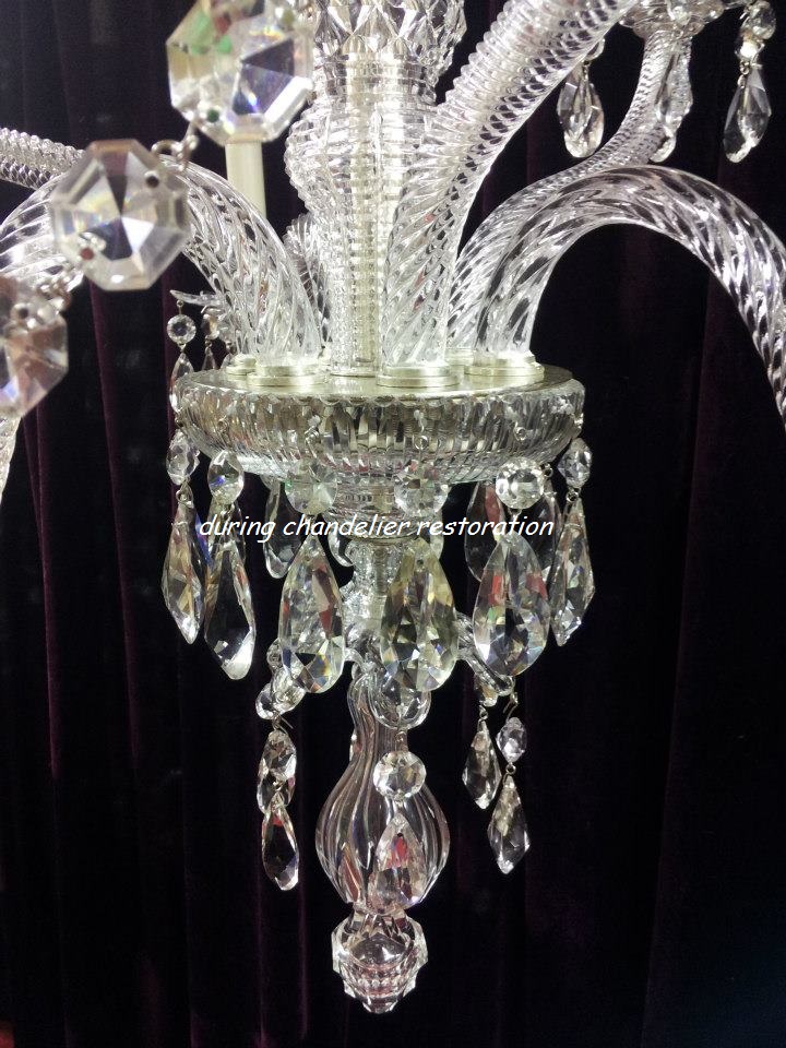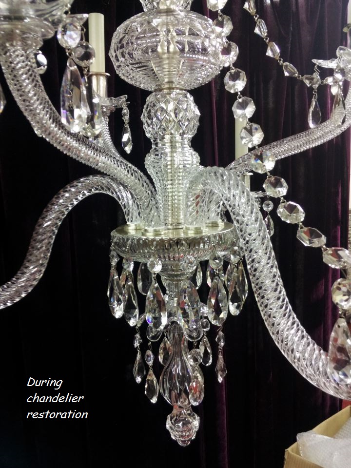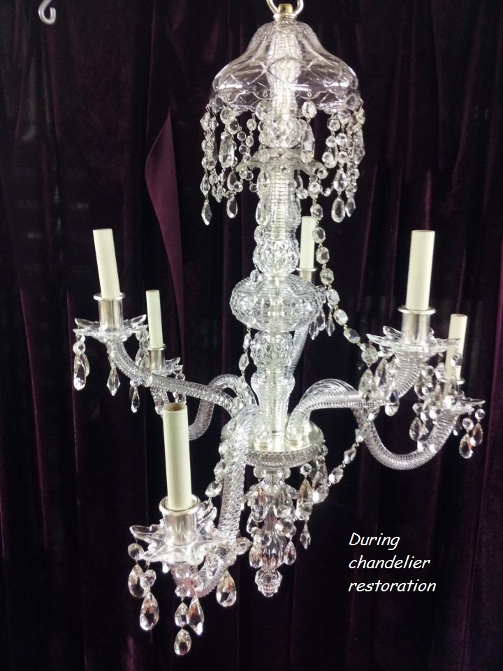 All chandelier restoration work is undertaken by qualified personnel and our restoration services include re-pinning, the repair and replacement of broken crystal, plating and polishing in the appropriate finish.